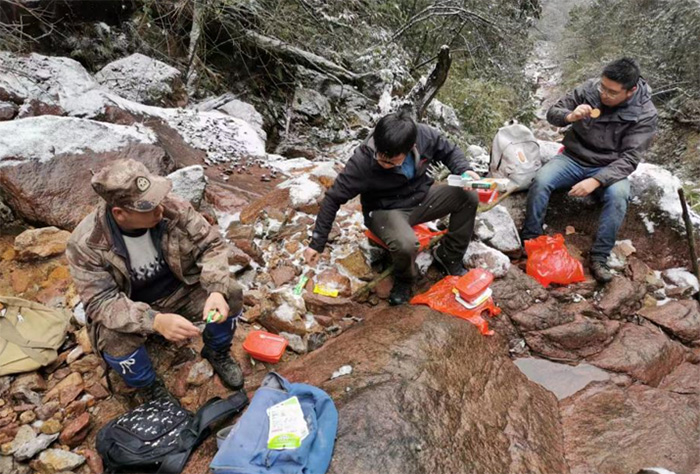 2021年12月的一天,勘察分院麥高飛同志與其他同志早上7點天未亮就起床去腳基坪電站廠房接向導(林場護林員),8點30分在溝口架設好RTK基站后,他們和兩名向導就沿著泥石流溝(黃沙溝)順溝而上,沿途雨雪交加,雪越下越大,到處都是陡坎跌水與溪流,在向導帶領下,他們四肢并用攀爬在亂石遍布的溝谷,經過不懈的努力,終于在中午兩點左右測放完粽隧ZK2號深孔。饑寒交迫的他們在附近的小溪邊冒雪草草吃了幾口自熱方便飯后,就立即返程。于晚上6點30分左右安全到達腳基坪電站附近的318國道邊,共用時10個小時。在上山的路上,汗水濕透了內衣,雨雪打濕了外套,放孔后的他們被寒風吹得瑟瑟發抖,艱難到達318國道邊后,累得癱坐在公路邊的值班車上,只想坐下來好好休息。這僅僅是麥高飛同志進行地質勘察工作的一個縮影!這也是麥高飛同志的工作日常!