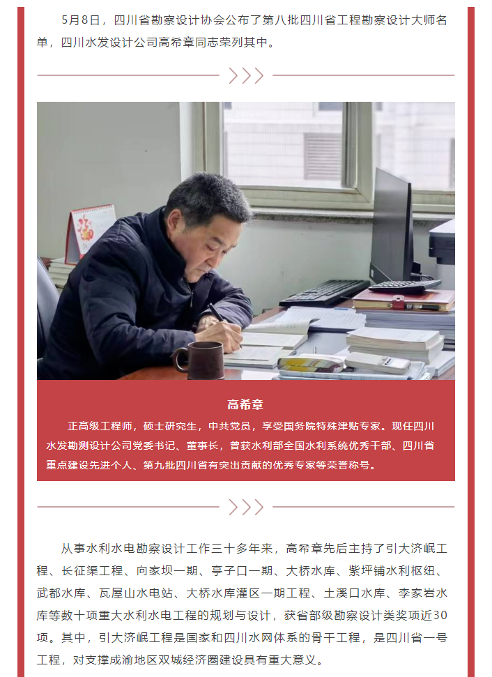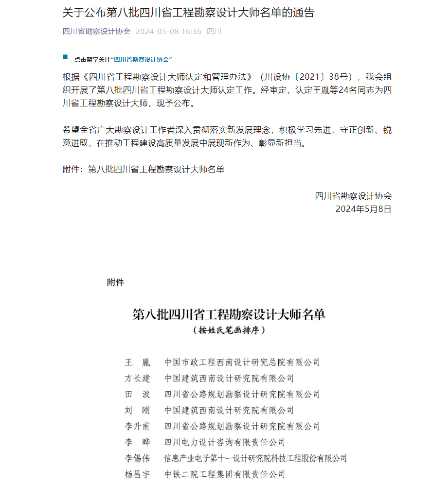 喜報(bào)!設(shè)計(jì)公司高希章同志榮獲“四川省工程勘察設(shè)計(jì)大師”稱號(hào)