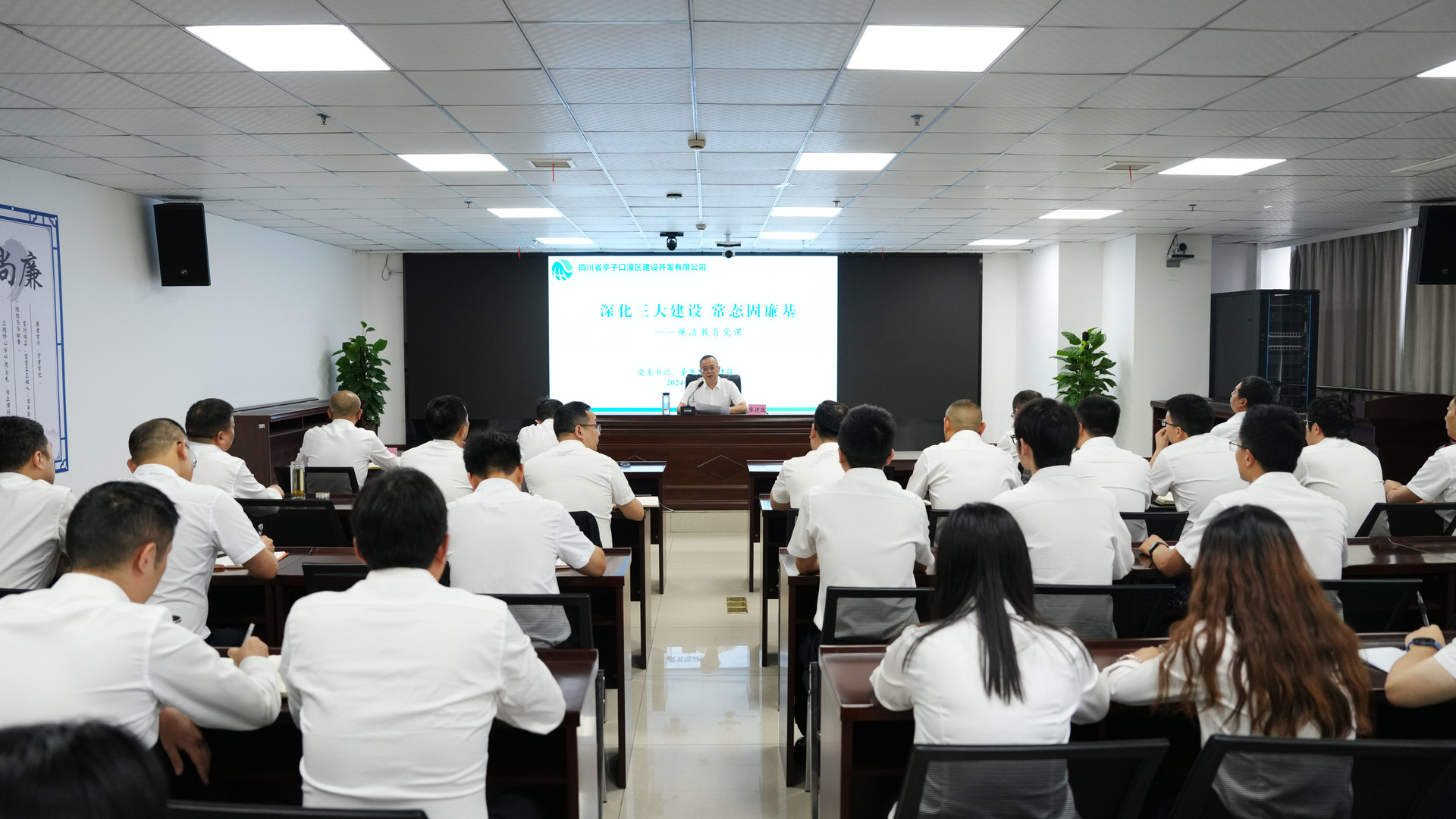 最后,公司黨委書記、董事長廖建強以“深化三大建設、常態固廉基”為主題為全體干部職工講了一堂生動的廉潔黨課。他強調,一要深化政治建設,做到“三個始終”,始終堅定理想信念,矢志不渝為中國特色社會主義事業而奮斗,始終堅定政治立場,嚴格遵守“六大紀律”,始終牢記初心使命,早日實現亭子口灌區工程建成通水,早日惠澤川東北人民;二要深化紀律建設,做好“三個持續”,以黨紀教育為抓手持續夯實政治責任,以基層黨支部紀檢委員試點工作為載體持續強化履責盡責,以廉潔工程共建為平臺持續推進黨風廉潔建設。三要深化廉潔建設,做到“三個管住”,自覺管住權力、自覺管住欲望、自覺管住小節。全體干部職工要嚴守紀律規矩,扣緊廉潔從業的扣子,堅決做到亭子口工程建設起來,干部不倒下。
